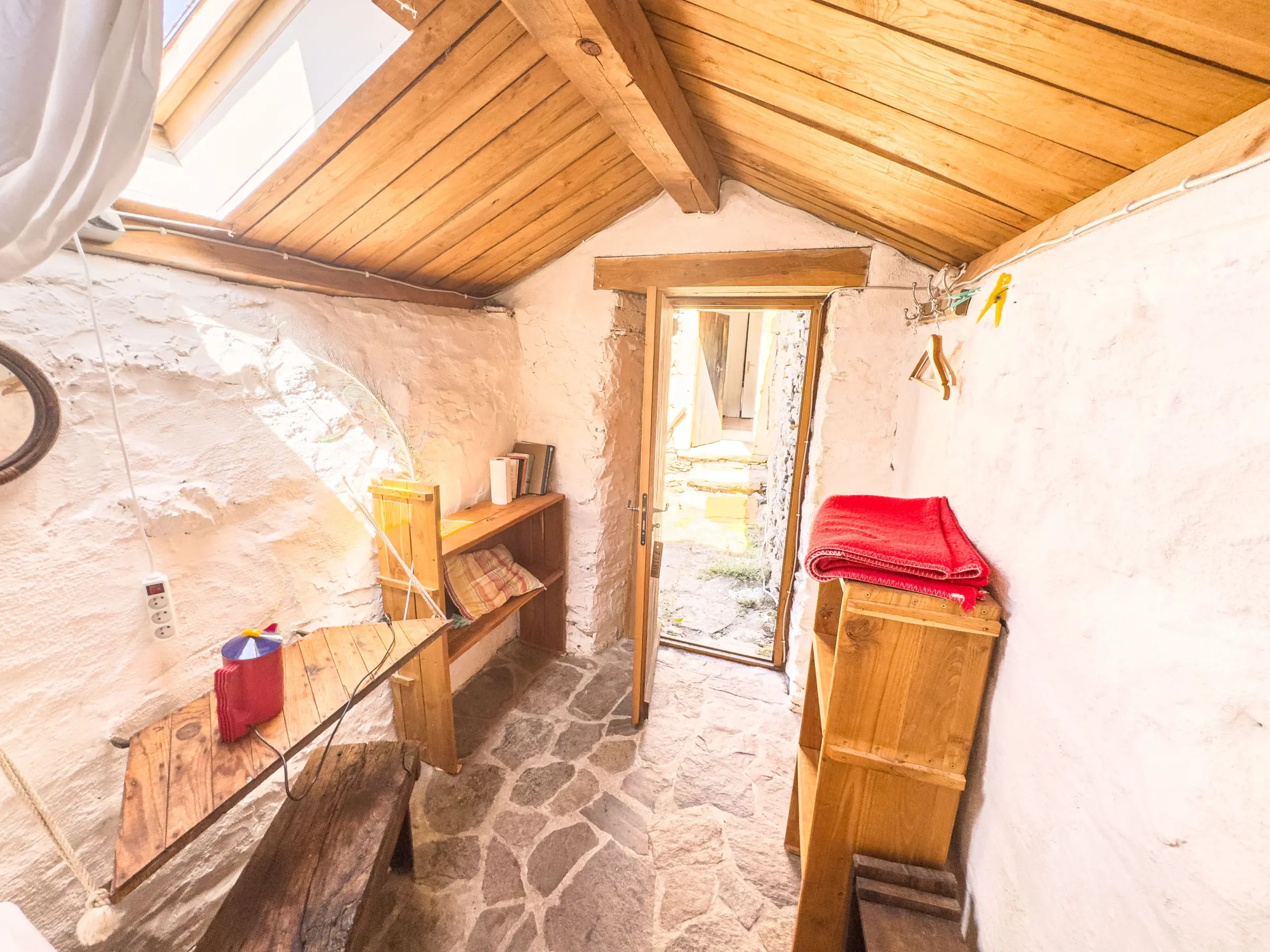 One of the smallest shelters in Bardou, Birte’s is bright and compact. A roof window fills the room with light by day and reveals the stars by night. Taller guests may find the bed short, but it adds to the charm. This house is close to the Forum bathroom. Birte lived in it in the 1980s, while writing her master thesis about Bardou.
