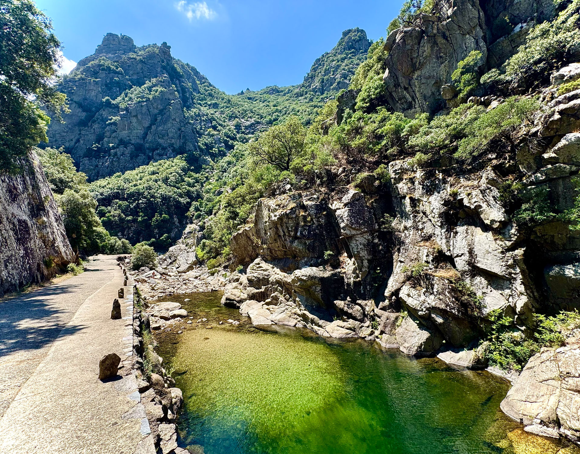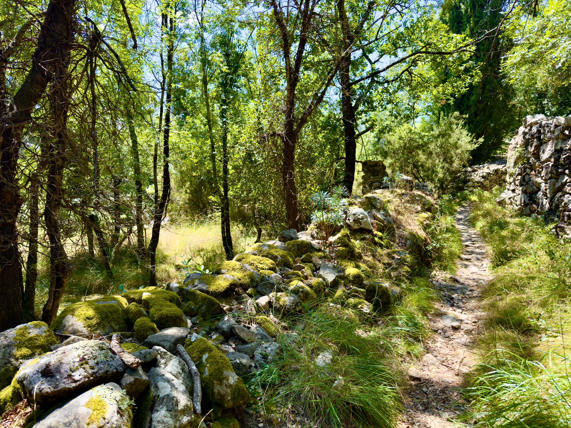 The countryside around Bardou is a wild, enchanting mountain area in the Haut Languedoc, southern France. Nestled at about 570 meters altitude, it is a mosaic of chestnut and oak forests, scrubland, and rugged terrains with ancient terraces and stone walls built centuries ago. Streams and natural springs weave through the landscape, which blooms with aromatic herbs and wildflowers. Seasonal shifts paint it lush green in spring and autumn, and stark in dry, hot summers prone to forest fires. Its remoteness preserves traditional rural life, with sheep grazing freely and ancient pathways hinting at a long historical heritage, harmonizing nature and history beautifully.